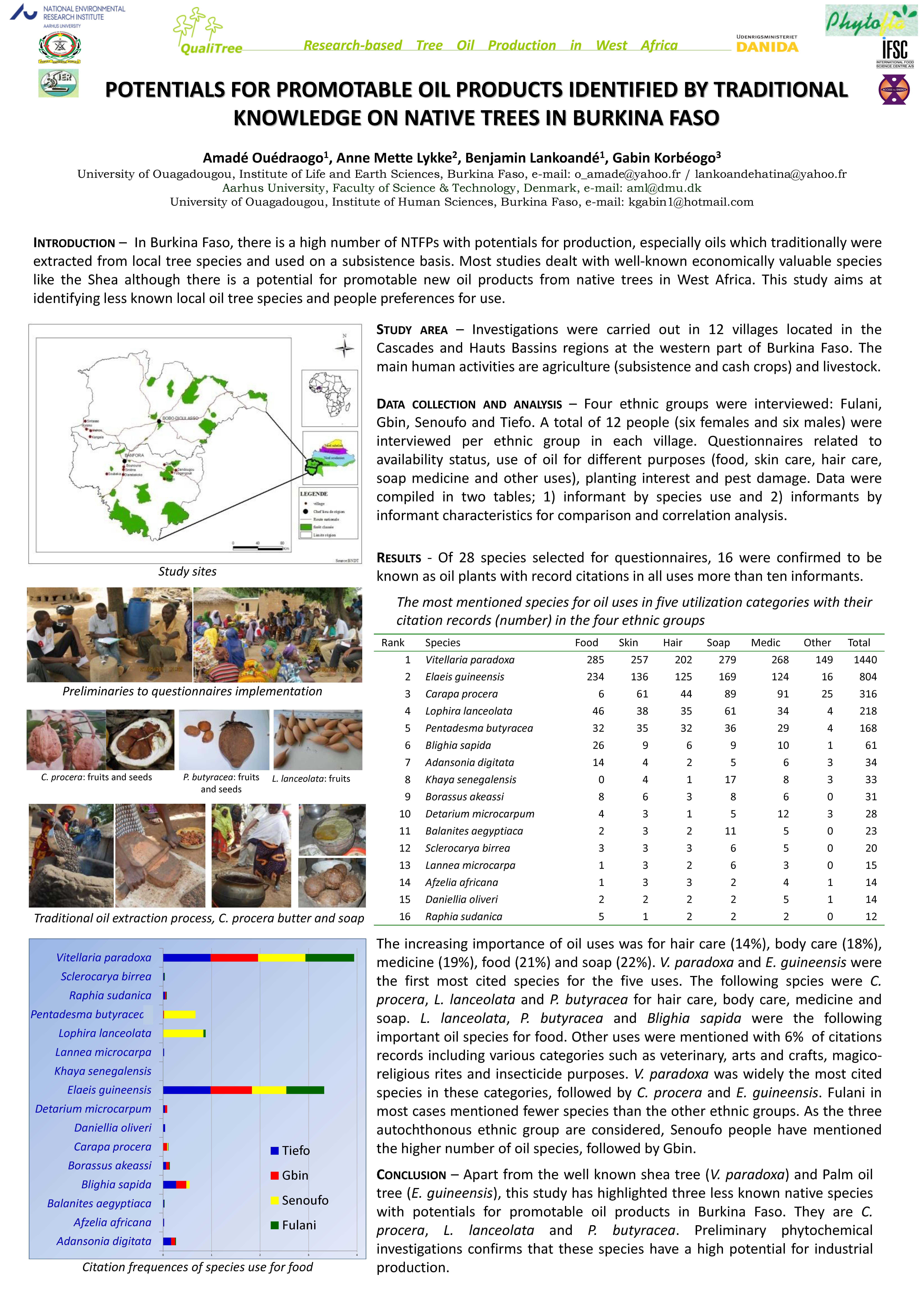 Amadé Ouédraogo, Anne Mette Lykke, Benjamin Lankoandé1, Gabin Korbéogo, 2012. Potentials for promotable oil products identified by traditional knowledge on native trees in Burkina Faso, 13th Congress of the International Society of Ethnobiology, Paris.